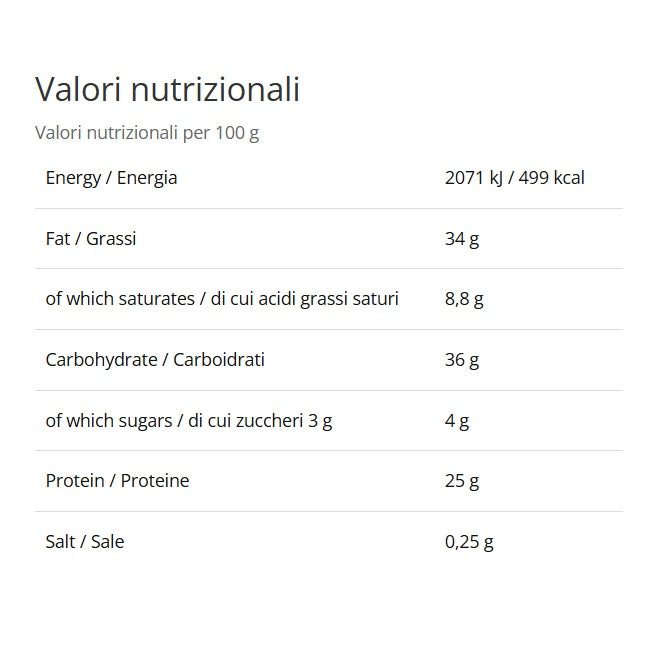 Edulcorante: maltitolo; proteine del siero del latte, olio vegetale (shea), olio di girasole, farina di soia, latte in polvere, emulsionante: lecitine (soia); aroma.
