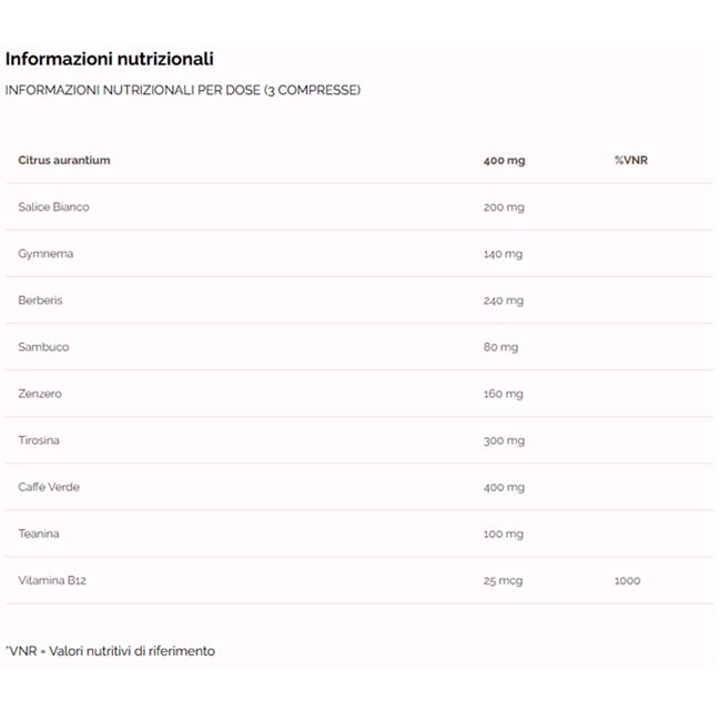 Citrus aurantium(Citrus aurantium L.var, amara frutto immaturo e. s. 6 % Sinefrina), Caffe Verde (Coffea Arabica L. semi e. s. 45% acidi clorogenici), agente di carica: Calcio difosfato; addensante: Cellulosa microcristallina; L-Tirosina, Gymnema (Gymnema silvestre R.BR. foglie e.s. 25% acido Gimnemico), Berberis (Berberis aristata DC. corteccia e rami e. s. 65% Berberina), Salice bianco(salix alba corteccia e. s. 3% salicilina), Antiagglomeranti; Magnesio stearato, stabilizzante gliceril beenato, Zenzero(Zingiber officinalis ROSC. rizoma e. s. 5 % Gingeroli), L-Teanina, Samburo (Sambucus nigra fiori e. s. 1% Antociani), Cianocobalammina (Vitamina B12).