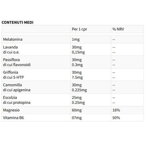 FIZZcarrier® [edulcoloranti: mannitolo, sorbitolo, xilitolo, sucralosio; bicarbonato di potassio, acidificanti: acido malico, acido tartarico] 65%; Agente di carica: cellulosa microcristallina; Ossido di magnesio; Agenti antiagglomeranti: biossido di silicio, Sali di magnesio degli acidi grassi; Lavanda (Lavandula angustifolia Mill.) fiore e.s. tit. 0,5% o.e; Passiflora (Passiflora incarnata L.) parte aerea con fiori e.s. tit. 1% flavonoidi; Griffonia (Griffonia simplicifolia (DC.) Baill.) seme e.s. tit. 25% 5-HTP ( 5-idrossitriptofano); Camomilla (Matricaria chamomilla L.) fiore e.s. tit. 0,75% apigenina; Escolzia (Eschscholzia californica Cham.) parte aerea e.s. tit. 1% protopina; Aroma; Agente stabilizzante: Mono e digliceridi degli acidi grassi; Sali di magnesio dell’acido citrico; Melatonina; Vitamina B6 (cloridrato di piridossina).