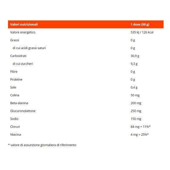 Gusto limone: 49% di maltodestrina, acqua, 15% di fruttosio, citrato di sodio, acido citrico (regolatore dell'acidità), glucuronolattone, beta-alanina, acido tartarico (regolatore dell'acidità), cloruro di sodio, cloruro di colina, benzoato di sodio (conservante), aromi, acido sorbico (conservante), nicotinamide, glicoside steviolico (edulcorante). Gusto mela verde: 49% di maltodestrina, acqua, 15% di fruttosio, citrato di sodio, acido citrico (regolatore dell'acidità), glucuronolattone, beta-alanina, acido tartarico (regolatore dell'acidità), cloruro di sodio, cloruro di colina, benzoato di sodio (conservante), aromi, acido sorbico (conservante), nicotinamide, glicoside steviolico (edulcorante).