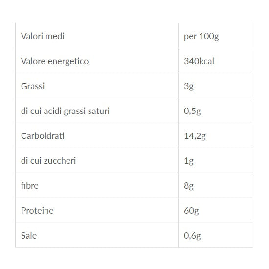 Proteine del grano (glutine), farina di frumento, proteine isolate della soia, albume d'uovo in polvere (5%), proteine del latte, proteine del pisello, fibra di frumento, stabilizzante: gomma di guar.