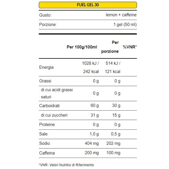 Una porzione di Powerbar Fuel Gel 30 contiene 30 g di carboidrati con un rapporto di 1:0.8 tra fonti di glucosio e fruttosio, per un apporto energetico ottimale durante le prestazioni sportive.