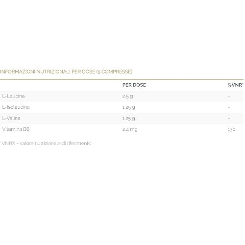 L-Leucina, L-Isoleucina, L-Valina, Stabilizzanti: biossido di silicio, sali di magnesio degli acidi grassi, Amido di Mais; Agente di carica: cellulosa microcristallina; Vitamina B6 (Cloridrato di piridossina).