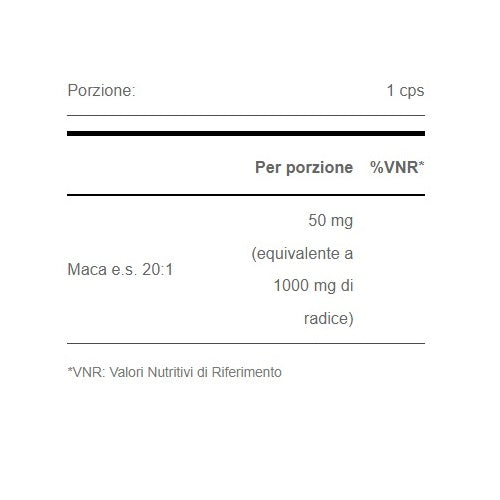 Agenti di carica: cellulosa microcristallina, fosfato dicalcico; Maca e.s. 20:1 (Lepidium meyenii Walp., radice); agenti antiagglomeranti: magnesio stearato vegetale, biossido di silicio. Capsula: idrossipropilmetilcellulosa. SENZA GLUTINE.