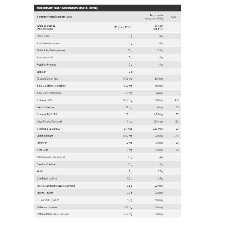 Prodotto dietetico per sportivi a base di Carboidrati, Creatina, Caffeina, Tè Verde, Vitamine, Calcio Corallo ed altri minerali. La Creatina incrementa le prestazioni fisiche in caso di attività ripetitive, di elevata intensità e di breve durata; il Calcio contribuisce alla normale funzione muscolare. L’estratto di Tè Verde ha un effetto tonico e di contrasto della stanchezza fisica e mentale; Il Ferro, l’Acido Folico, la Niacina e le Vitamine B6, B12 e C contribuiscono alla riduzione della stanchezza e dell’affaticamento. L’estratto di Tè Verde ha proprietà antiossidanti; lo Zinco e la Vitamina C contribuiscono alla protezione delle cellule dallo stress ossidativo. Il prodotto non contiene lattosio.