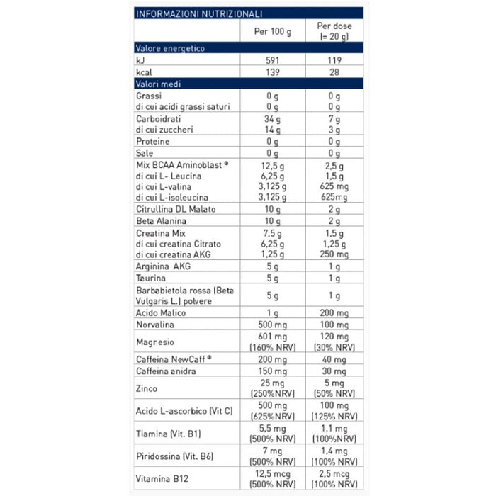 STARTER 1000 è un integratore specifico per la fase PRE-Gara o PRE-Workout. Apporta Citrullina, Arginina, Norvalina, Beta-Alanina, Taurina, Creatina, Caffeina, BCAA e Vitamine, ingredienti molto utili per la prestazione sportiva. La caffeina (70mg/dose) contribuisce ad aumentare l’attenzione e la concentrazione. La caffeina micro-incapsulata (NewCaff™) permette inoltre un rilascio graduale per un effetto più modulato e costante. Le vitamine contribuiscono alla riduzione della stanchezza e dell’affaticamento (B12, B6, C), al normale funzionamento del sistema nervoso (B1, B12, C), permettono il fisiologico metabolismo energetico (B12, B1, B6, C) e supportano il normale metabolismo delle proteine e del glicogeno (B6). Lo Zinco contribuisce alla normale sintesi proteica. Il prodotto apporta creatina, utile in caso di attività ripetitive di elevata intensità e di breve durata.