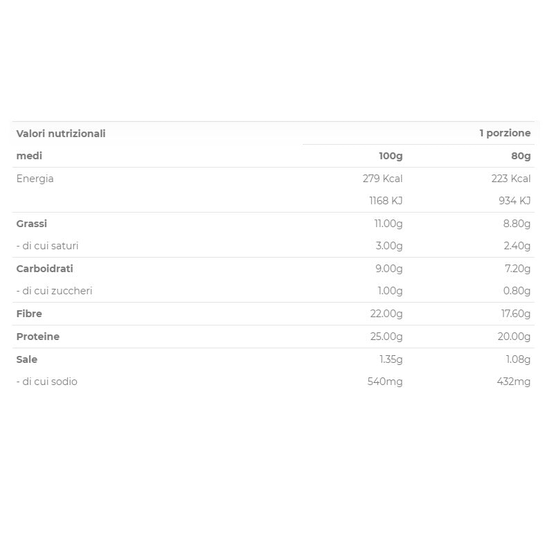 Proteine di pisello, proteine di riso, fibra di FRUMENTO, fibra di acacia, proteine del GRANO, olio d'oliva, semi di SESAMO (3%), sale, lievito, emulsionante: lecitina di girasole, e471, conservanti: potassio sorbato