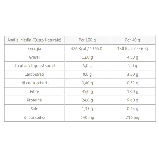Gusto Cacao: fibra di FRUMENTO, fibra di acacia, proteine del GRANO, proteine d'AVENA, proteine di riso, cacao (5%), MANDORLE (3%), NOCCIOLE (3%), olio d'oliva, lievito naturale, sale, edulcoranti: sucralosio, emulsionante: e471, lecitina di girasole.