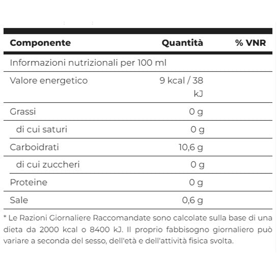 acqua, edulcoranti (eritritolo, maltitolo, sucralosio e glicosidi steviolici), stabilizzante (gomma di xanthan), sale, fibra vegetale, aromi, acidificante (acido lattico), coloranti (biossido di titanio e caroteni) e conservante (sorbato di potassio).