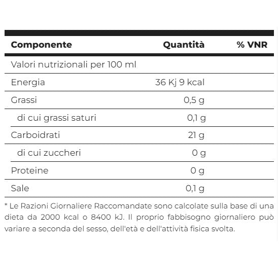 acqua, edulcoranti (eritritolo, sucralosio, e glicosidi), , stabilizzanti (esteri di saccarosio degli acidi grassi e gomma di xanthan), aromi, acidificante( acido lattico), conservante( sorbato di potassio), sale, e coloranti (beta carotene).