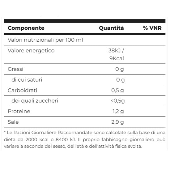 acqua, edulcoranti (eritritolo, maltitolo, sucralosio e glicosidi steviolici), stabilizzante (gomma di xanthan), sale, fibra vegetale, aromi, acidificante (acido lattico), coloranti (biossido di titanio e caroteni) e conservante (sorbato di potassio).