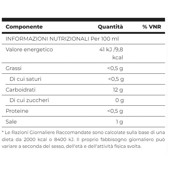 acqua, edulcoranti (eritritolo, maltitolo, sucralosio e glicosidi steviolici), stabilizzante (gomma di xanthan), sale, fibra vegetale, aromi, acidificante (acido lattico), coloranti (biossido di titanio e caroteni) e conservante (sorbato di potassio)..