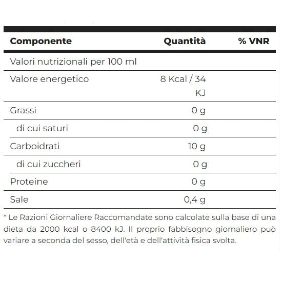 acqua, edulcoranti (eritritolo, maltitolo, sucralosio e glicosidi steviolici), stabilizzante (gomma di xanthan), sale, fibra vegetale, aromi, acidificante (acido lattico), coloranti (biossido di titanio e caroteni) e conservante (sorbato di potassio).