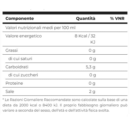 acqua, edulcoranti (eritritolo, maltitolo, sucralosio e glicosidi steviolici), stabilizzante (gomma di xanthan), sale, fibra vegetale, aromi, acidificante (acido lattico), coloranti (biossido di titanio e caroteni) e conservante (sorbato di potassio).