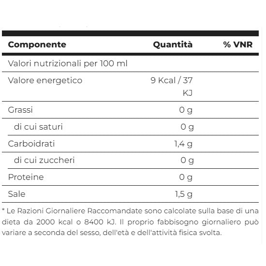 acqua, edulcoranti (eritritolo, maltitolo, sucralosio e glicosidi steviolici), stabilizzante (gomma di xanthan), sale, fibra vegetale, aromi, acidificante (acido lattico), coloranti (biossido di titanio e caroteni) e conservante (sorbato di potassio).