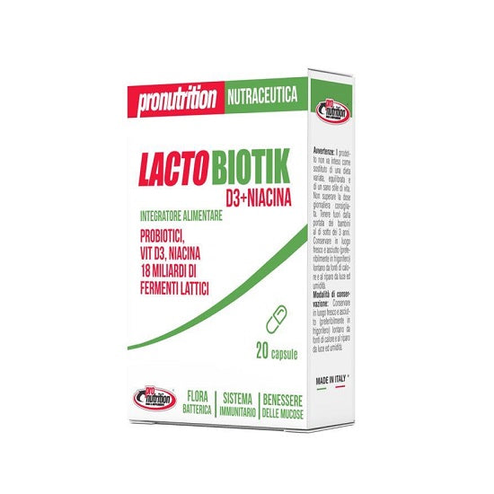 Integratore Alimentare a base dei probiotici L.Plantarum, L.Acidophilus, L.Rhamnosus e B.Animalis in grado di favorire l’equilibrio della flora intestinale. La niacina contribuisce al mantenimento di membrane mucose normali mentre la vitamina D contribuisce alla normale funzione del sistema immunitario. I fermenti lattici sono dei microrganismi vivi che possono apportare benefici alla salute dell'intestino e dell'organismo in generale. Tra i vari tipi di fermenti lattici disponibili sul mercato, i Lactobiotik Pronutrition si distinguono per la loro qualità e la loro efficacia.