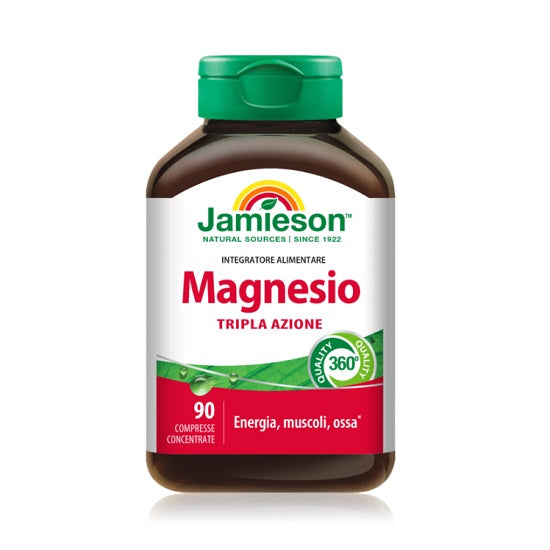 Il magnesio è un minerale che svolge diverse funzioni essenziali nel nostro organismo. Contribuisce alla riduzione della stanchezza e dell’affaticamento, al normale metabolismo energetico e alla normale funzione muscolare, contrastando l’insorgere di crampi muscolari. Inoltre il magnesio contribuisce al mantenimento di ossa e denti normali e partecipa come cofattore a molte reazioni che avvengono all’interno della cellula, come la sintesi di proteine e la produzione di energia. Inoltre supporta l’equilibrio elettrochimico e interviene nel processo di divisione delle cellule. La carenza di magnesio può portare a crampi e contrazioni muscolari, intorpidimenti e aritmie. Il magnesio è abbondante nei vegetali a foglia verde, nei legumi, nella frutta secca e nei cereali integrali. Magnesio tripla azione di Jamieson contiene magnesio inorganico (ossido di magnesio) e due fonti di magnesio organico, il magnesio gluconato e il magnesio lattato.