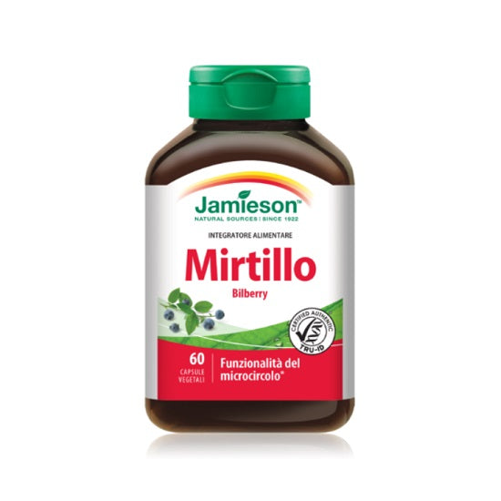 Il mirtillo nero (Vaccinium myrtillus) è una pianta appartenente alla famiglia delle Ericacee i cui frutti sono ricchi di antocianosidi. Gli antociani sono dei flavonoidi con una funzione antiossidante, utile per contrastare l’azione dei radicali liberi. Inolte il mirtillo contribuisce alla funzionalità del microcircolo (riduce sensazione di pesantezza delle gambe), al mantenimento di una normale capacità visiva e alla preservazione delle vie urinarie, riducendo i disturbi associati ad eventuali infezioni. Mirtillo bilberry di Jamieson è standardizzato per contenere il 36% di antocianosidi; questo assicura la presenza sempre della medesima quantità di principi attivi in ogni capsula. Jamieson seleziona accuratamente i frutti della pianta del mirtillo che cresce nel Nord Europa. La raccolta avviene solamente alla fine della stagione estiva, quando i frutti sono nel pieno della loro maturità.