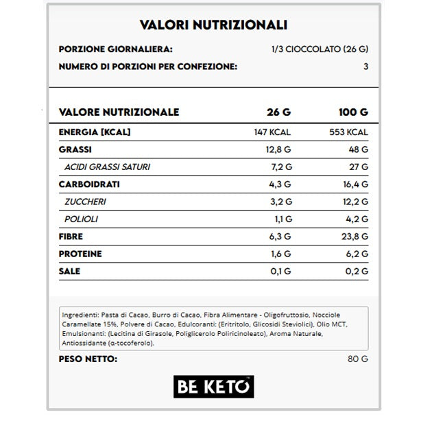 La Cioccolata Keto Vegana con Olio MCT e Nocciole Caramellate unisce la ricchezza del gusto ai benefici per la salute. Questa straordinaria combinazione di cacao intenso e nocciole caramellate permette anche a chi segue una dieta chetogenica o a basso contenuto di carboidrati di godere di un’esperienza culinaria unica. L’Olio MCT, un prezioso ingrediente che supporta il metabolismo, aggiunge funzionalità alla nostra cioccolata, aiutando nel processo di chetosi. Grazie alla composizione 100% vegana, priva di prodotti di origine animale, è ideale per chi cerca alternative senza latticini.