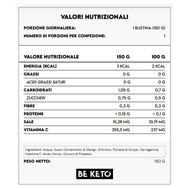 Acqua, Succo Concentrato di Mango, Eritritolo, Polvere di Konjac, Carragenina, Vitamina C, Acido Citrico, Cloruro di Potassio.