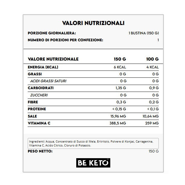 Acqua, Concentrato di Succo di Mela, Eritritolo, Polvere di Konjac, Carragenina, Vitamina C, Acido Citrico, Cloruro di Potassio.