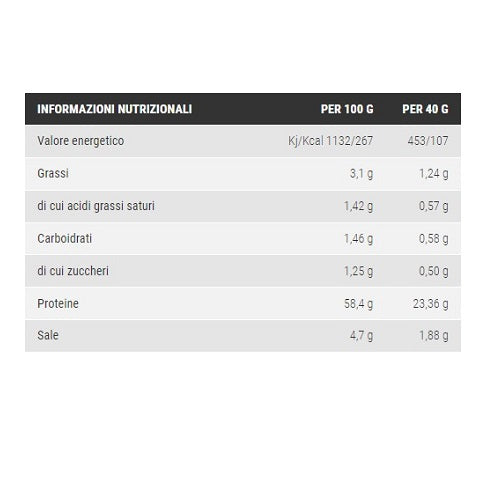 Snack proteico a base di carne di manzo di prima qualità. Ogni busta da 40 g apporta più del 50% di proteine ad alto valore biologico ed una ridottissima quantità di grassi e carboidrati. La carne utilizzata è di origine europea e viene utilizzata solo quella che supera la selezione di qualità. Essa viene degrassata e lasciata essiccare con una lavorazione totalmente manuale. Gli aromi utilizzati sono totalmente naturali (sale, pepe, aglio e spezie) ed il prodotto si presenta a strisce per poterla gustare comodamente in ogni momento della giornata.