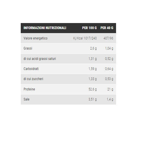 Snack proteico a base di carne di tacchino di prima qualità. Ogni busta da 40 g apporta più del 50% di proteine ad alto valore biologico ed una ridottissima quantità di grassi e carboidrati. La carne utilizzata è di origine europea e viene utilizzata solo quella che supera la selezione di qualità. Essa viene degrassata e lasciata essiccare con una lavorazione totalmente manuale. Gli aromi utilizzati sono totalmente naturali (sale, pepe, aglio e spezie) ed il prodotto si presenta a strisce per poterla gustare comodamente in ogni momento della giornata.