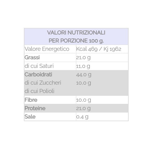 Può contenere altra FRUTTA A GUSCIO, SESAMO, UOVA, proteine del LATTE.