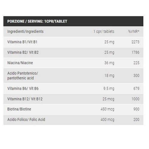 Integratore alimentare di Vitamine del gruppo B e Acido Folico. L’Acido Pantotenico, la Niacina la Biotina e le Vitamine B1, B2, B6 e B12 contribuiscono al normale metabolismo energetico; l’Acido Pantotenico, l’Acido Folico, la Niacina e le Vitamine B2, B6 e B12 contribuiscono alla riduzione della stanchezza e dell’affaticamento. La Biotina, la Niacina e le Vitamine B1, B2, B6 e B12 contribuiscono al normale funzionamento del sistema nervoso. L’Acido Folico e le Vitamine B6 e B12 contribuiscono alla normale funzione del sistema immunitario.