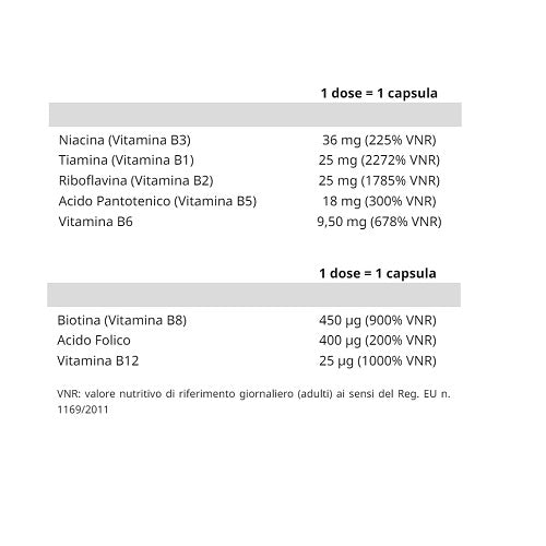 Amido di mais, gelatina alimentare (involucro), niacina (nicotinamide), Tiamina HCl (vitamina B1), riboflavina (vitamina B2), calcio D-pantotenato (acido pantotenico), agente antiagglomerante: biossido di silicio; piridossina HCl (Vitamina B6), D-biotina (biotina), acido pteroil-monoglutammico (acido folico), cianocobalamina (vitamina B12).