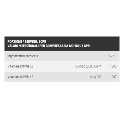 Integratore Alimentare a base di Vitamina D3 e K2. Le vitamine K2 e D3 utilizzate sono ottenute per fermentazione vegetale. La D3 da lichene islandico e la K2 è sotto forma di menachinone-7. Le vitamine D e K contribuiscono al mantenimento di ossa normali. La Vitamina D contribuisce al normale assorbimento/utilizzo del calcio e del fosforo ed a normali livelli di calcio nel sangue ed al mantenimento della normale funzione muscolare e normale funzione del sistema immunitario. Il prodotto non contiene naturalmente lattosioAgenti di carica: Cellulosa microcristallina e Calcio Difosfato, Antiagglomerante: Magnesio Stearato, Menachinone (Vitamina K), Colecalciferolo (Vitamina D3)