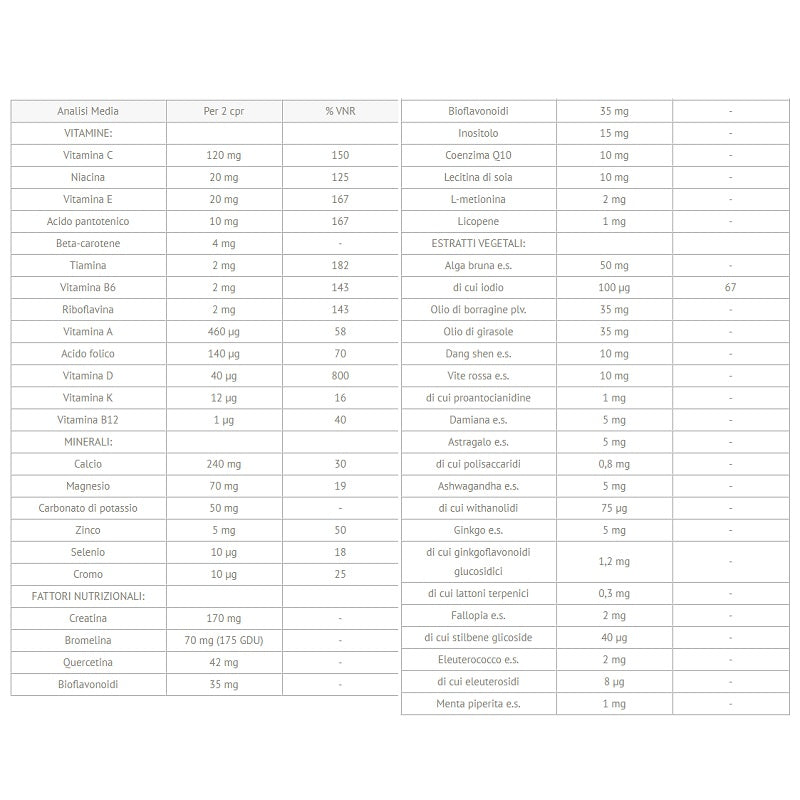 Agente di carica: cellulosa microcristallina, gel di cellulosa; carbonato di calcio; sali di calcio dell'acido ortofosforico; creatina monoidrato; vitamina C (acido L- ascorbico); agente antiagglomerante: mono-e digliceridi degli acidi grassi; ossido di magnesio; bioflavonoidi da agrumi; bromelina da ananas (Ananas comosus (L.) Merr., stipiti) 2500 GDU/g; vitamina E (acetato di DL-alfa- tocoferile); agente antiagglomerante: biossido di silicio; carbonato di potassio; alga bruna [(Fucus vesiculosus L., tallo), (Ascophyllum nodosum (L.) Le Jolis, tallo)] e.s. standardizzato 0,2% iodio; quercetina (da Styphnolobium japonicum (L.) Schott., fiori); olio di semi di borragine in polvere (Borago officinalis L.) (agente antiagglomerante: biossido di silicio); olio di girasole; niacina (nicotinamide); licopene e.s. tit. 5% da pomodoro (Solanum lycopersicum L., frutti); vitamina D (colecalciferolo); inositolo; acido pantotenico (D-pantotenato, calcio); coenzima Q10; lecitina di soia; dang shen (Codonopsis pilosula (Franch.) Nannf., radice) e.s. E:D 1:4; vite rossa (Vitis vinifera L., semi) e.s. tit. 10% proantocianidine; ossido di zinco; vitamina K (menachinone); vitamina A (acetato di retinile); lievito arricchito in selenio; damiana (Turnera diffusa Wild. ex Schult., foglie) e.s. E:D 1:4; astragalo (Astragalus membranaceus Moench., radice) e.s. tit. 16% polisaccaridi; ashwagandha (Withania somnifera (L.) Dunal., radice) e.s. tit. 1,5% withanolidi; ginkgo (Ginkgo biloba L., foglie) e.s. tit. 24% ginkgoflavonoidi glucosidici, 6% lattoni terpenici; beta-carotene; tiamina (cloridrato di tiamina); vitamina B6 (cloridrato di piridossina); riboflavina (riboflavina); L-metionina; fallopia (Reynoutria multiflora (Thunb.) Moldenke, radice) e.s. tit. 2% stilbene glicoside; eleuterococco (Eleutherococcus senticosu (Rupr. et Maxim.) Maxim, radice) e.s. tit. 0,4% eleuterosidi B-E; vitamina B12 (cianocobalamina); menta piperita (Mentha x piperita L., foglie) e.s. E:D 1:4; acido folico (acido pteroil-monoglutammico); picolinato di cromo; agente antiagglomerante: sali di magnesio degli acidi grassi; aroma naturale; agenti di rivestimento: idrossi-propil-metilcellulosa, idrossi-propil-cellulosa, talco, carbonato di calcio; colorante: ossidi e idrossidi di ferro.