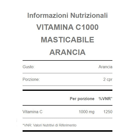 Integratore alimentare di vitamina C in comode compresse masticabili. Con zucchero ed edulcorante.