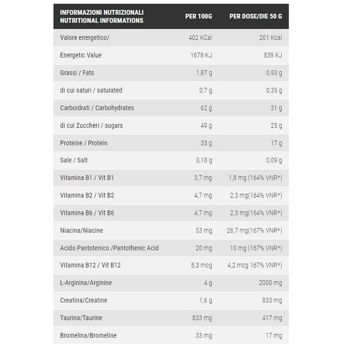 Ingredienti: Destrosio, Proteine del Siero di Latte concentrate WPC, Maltodestrine 19 DE, Arginina Cloridrato KIOWA, Creatina Monoidrato, Taurina, Aromi, Bromelina (2500 GDU), Nicotinamide (Niacina), Calcio D-Pantotenato (Acido Pantotenico), Piridossina Cloridrato (Vitamina B6), Riboflavina (Vitamina B2), Tiamina Cloridrato (Vitamina B1), Cianocobalamina (Vitamina B12).
