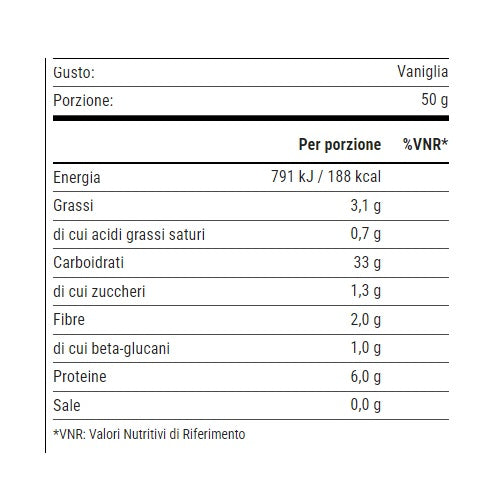 Gusto vaniglia: Farina di avena senza glutine (97,3%); aromi (latte); edulcorante: sucralosio. SENZA GLUTINE