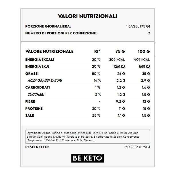 I Keto Bagel sono deliziosi prodotti da forno senza glutine e ad alto contenuto proteico, che in una confezione contengono ben 52,5g di grassi sani. La loro base è la farina di mandorle, che li rende non solo incredibilmente gustosi, ma anche nutrienti. Morbidi, soffici e perfetti da abbinare a una varietà di condimenti – dai Keto Marmellate e Creme alle verdure fresche. I Keto Bagel Senza Glutine sono confezionati con la più recente tecnologia MAP, che permette di mantenere la freschezza a lungo senza l’uso di conservanti.