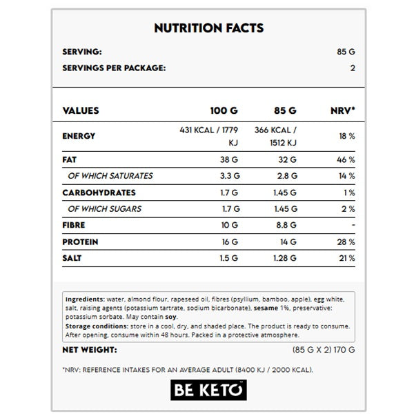 Panini Keto Senza Glutine per Burger sono probabilmente i migliori panini low-carb al mondo! Creati per gli amanti dei burger saporiti che seguono una dieta chetogenica o povera di carboidrati. Ricchi di farina di mandorle, olio di colza e fibre naturali (psillio, bambù, mela), offrono una consistenza perfetta e sazietà a lungo termine. Ogni porzione (85 g – 2 panini) fornisce proporzioni ideali di macronutrienti: 14 g di proteine, 32 g di grassi sani e solo 1,45 g di carboidrati. Morbidi all’interno e leggermente croccanti all’esterno – soddisfano la tua voglia di burger senza compromettere la chetosi.