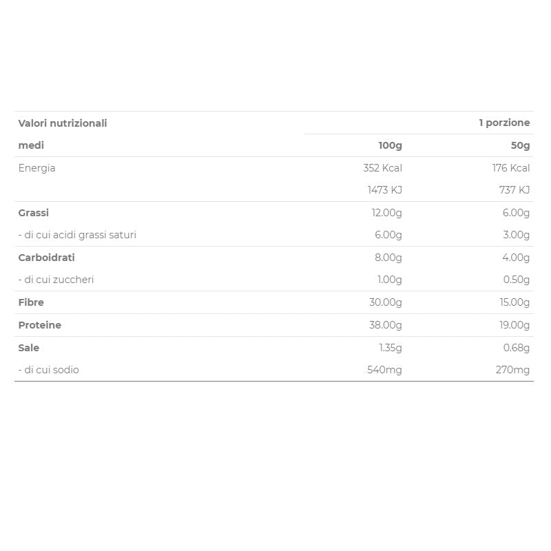 proteine del GRANO, proteine d'AVENA, proteine di riso, albume d'UOVO, fibra di FRUMENTO, fibra di acacia, olio d'oliva, lievito naturale, sale, semi di SESAMO (5%), emulsionante: lecitina di girasole, e471.