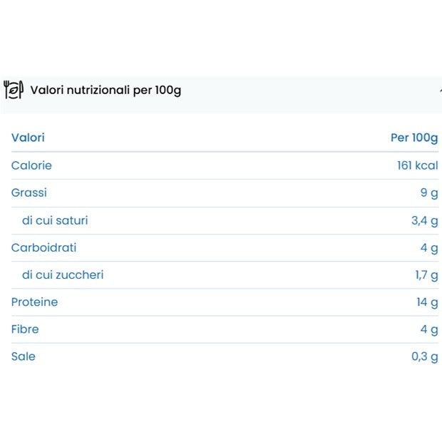 Polpa di pomodoro (polpa di pomodoro, correttore di acidità: acido citrico), carne bovina 22%, salsiccia di suino 15% (carne suina, acqua, sale, vino bianco, spezie, piante aromatiche, concentrato di barbabietole, antiossidanti: acido ascorbico), preparazione alimentare tipo pasta proteica senza glutine [fibre vegetali (fibra di frumento deglutinato, fibra di bambu, fibra di inulina, fibra di psillio), mix di proteine (proteine isolate di pisello, albume d'UOVO in polvere), UOVO, farina di mais, farina di riso, addensante: farina di semi di carrube], SEDANO, carote, cipolla, acqua, collagene idrolizzato, aromi naturali, olio extra vergine di oliva, spezie.