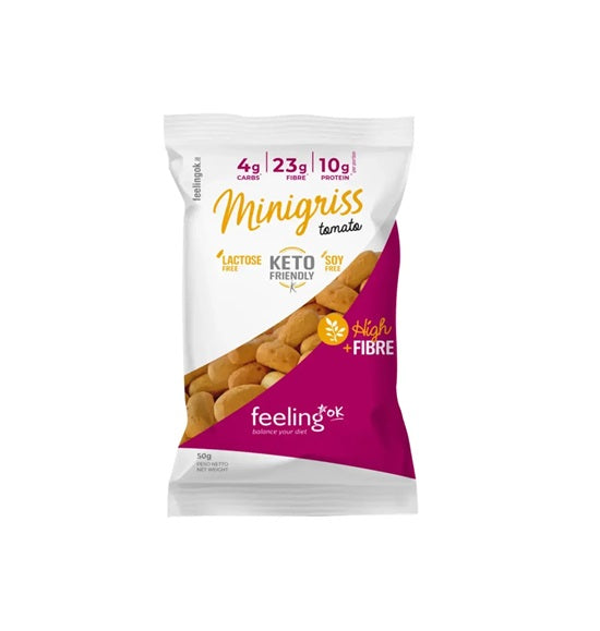 Gusta l'irresistibile croccantezza dei Minigriss Tomato +Fibre di Feeling Ok. Questi piccoli grissini sono arricchiti con soli 4g di carboidrati per porzione e un incredibile contenuto di 23g di fibre. Perfetti come snack salato o come accompagnamento al pasto principale, sono la scelta ideale per soddisfare la voglia di croccantezza senza sensi di colpa.